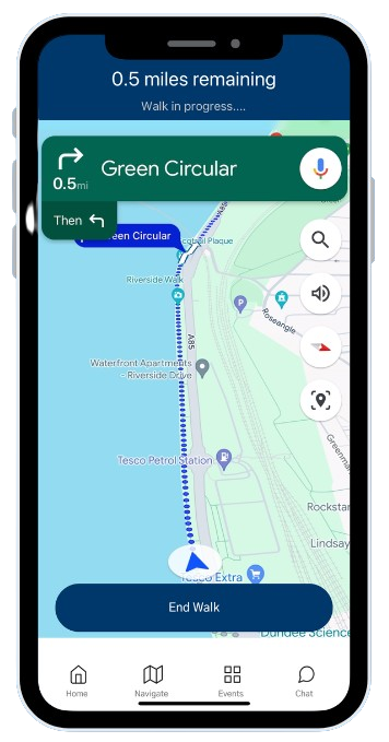 Navigate offers the user easy-to-follow walking routes, with Google Maps integration